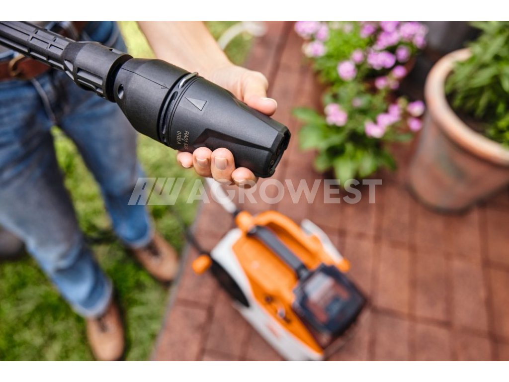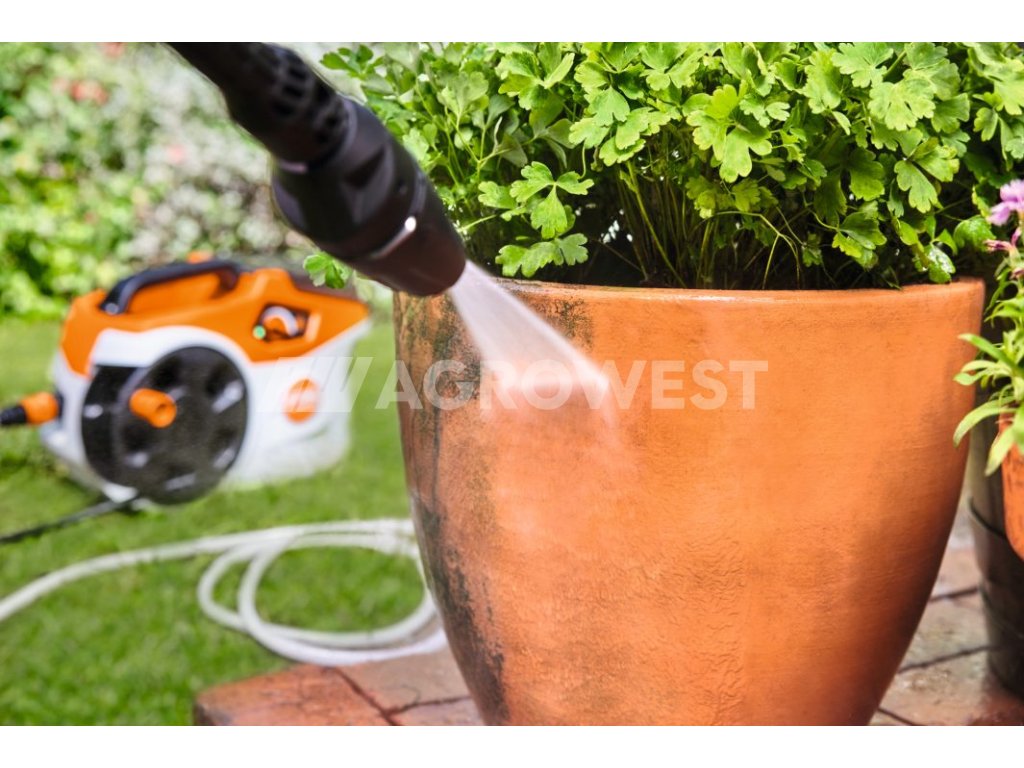Energii mu dodává výkonný akumulátor ze systému STIHL AK. Pokud nemáte v blízkosti k dispozici vodovodní přípojku, je možné připojit volitelně dostupnou sací hadici a pracovat v sacím režimu, například s využitím nasbírané dešťové vody z vodovodního kohoutku. Nebo si s sebou můžete vzít praktický vozík s 20litrovou nádrží na vodu, který je k dispozici jako příslušenství, a použít jej pro zásobování vodou na místě.