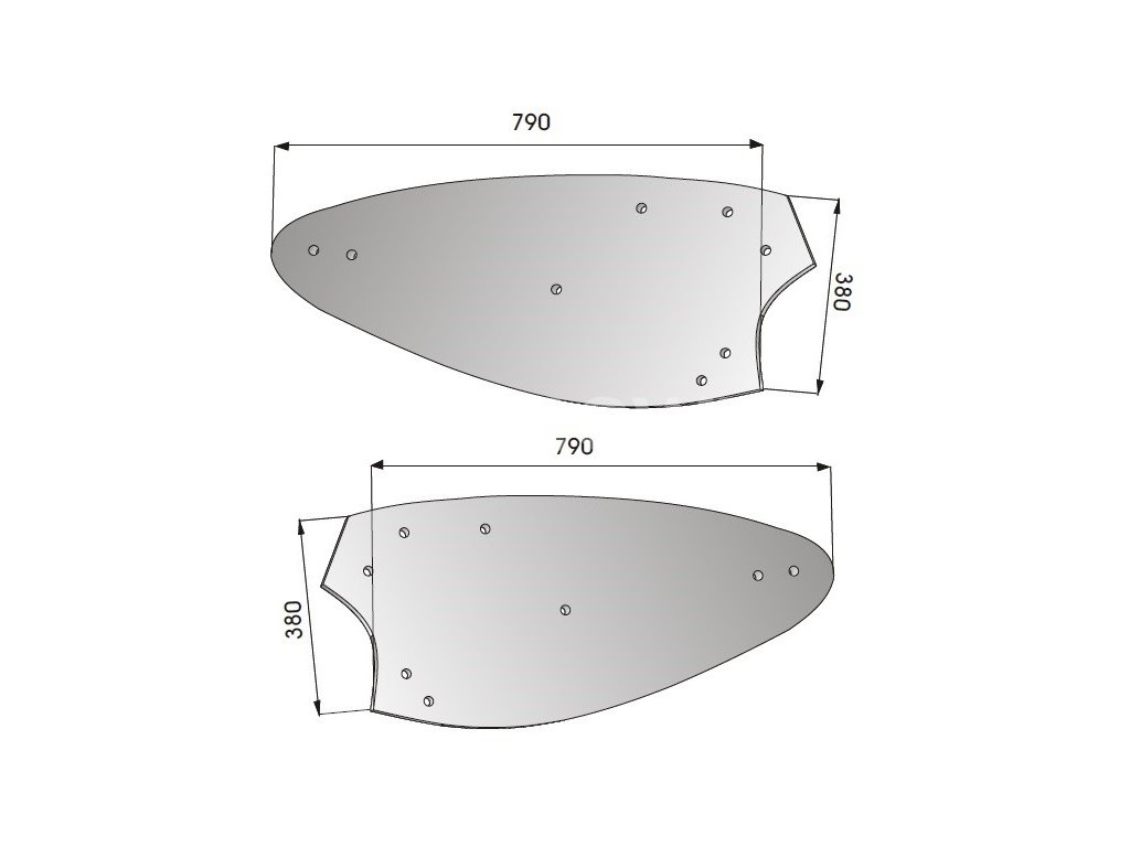 Odhrnovačka levá zadní díl pro pluhy Lemken, Ostroj typ B40BL 790 x 380 x 8 mm výrobce Agropa Group - typ B40B, opotřebitelný náhradní díl na pluh Lemken, Ostroj referenční číslo 3441041.