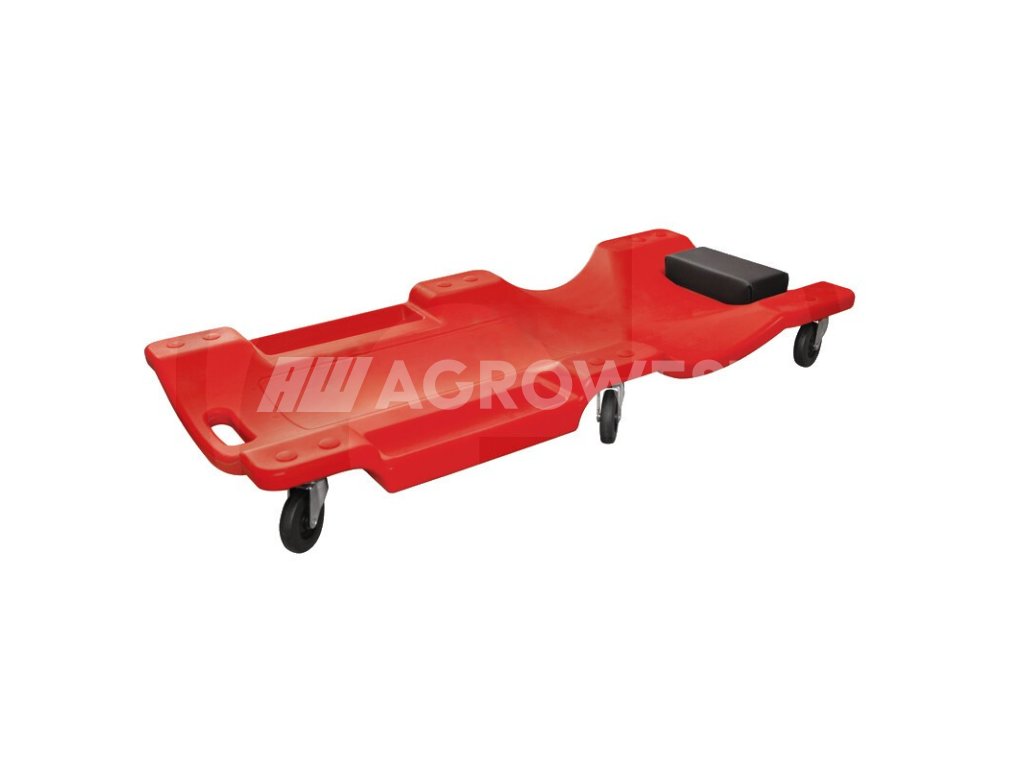Montážní lehátko z plastu se 6 otočnými kolečky, polštářkem pod hlavu a bočním úložným prostorem.