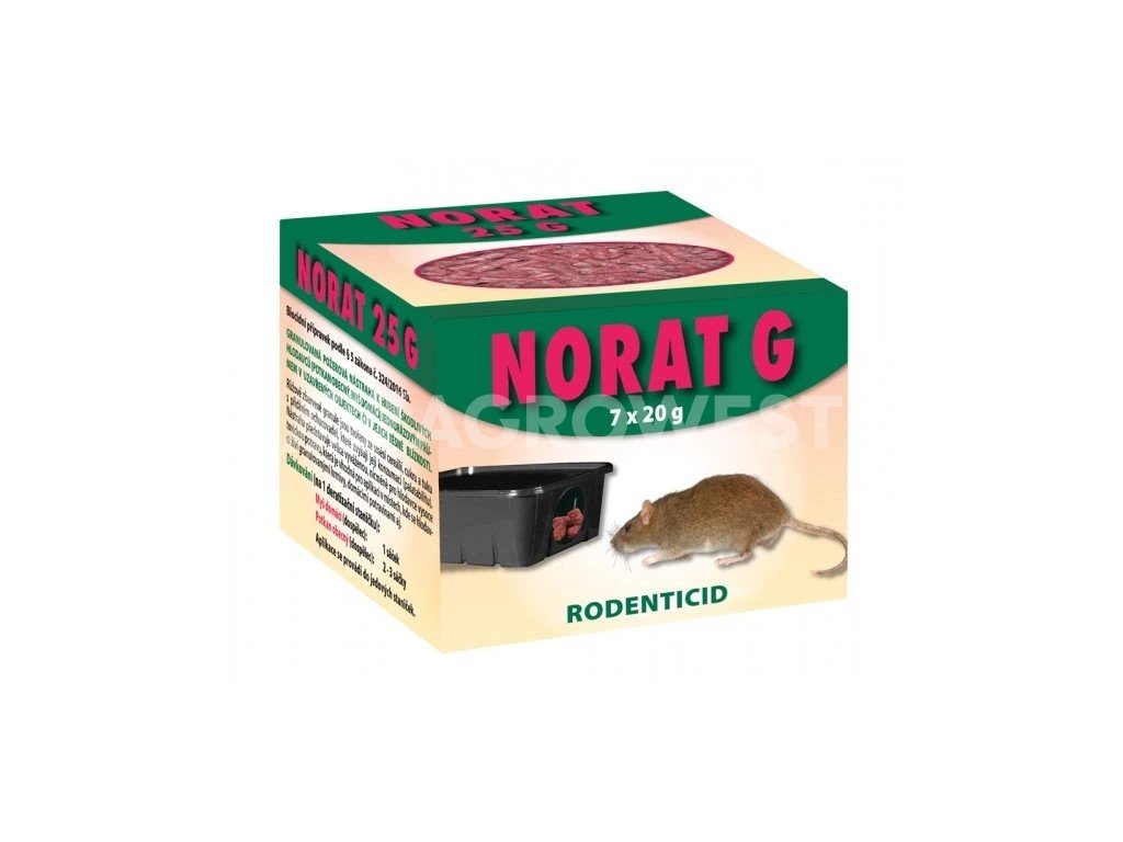 NORAT 25 G je granulovaná růžově zbarvená požerová nástraha k hubení škodlivých hlodavců jako je potkan, myš domácí v uzavřených objektech nebo jejich těsné blízkosti např. chaty, kůlny, bytové jednotky, sklepy, půdy apod.). NORAT 25 G je vyrobený ze směsi cereálií, cukru, tuku s přidáním dochucovadel, která zvyšují její konzumaci (palatabilitu). Nástraha představuje velice dobře vyváženou, nicméně však pro hlodavce vysoce toxickou potravu, která je zvláště výhodná pro použití v místech, kde se škodliví hlodavci živí granulovanými krmivy, domácími potravinami aj. Obsahuje hořké činidlo, které působí jako chuťový odpuzovač pro člověka.