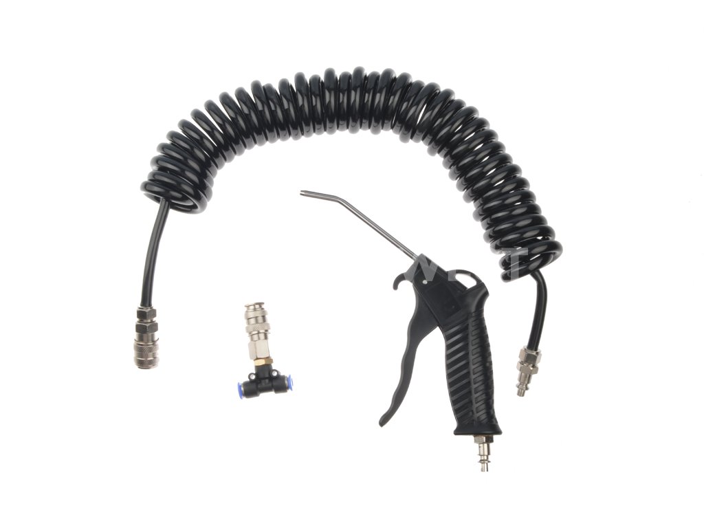 Pneumatická ofukovací a vyfukovací pistole s pružnou gumovou hadicí určená pro profesionální použití v nákladní dopravě, zejména u kamionů.