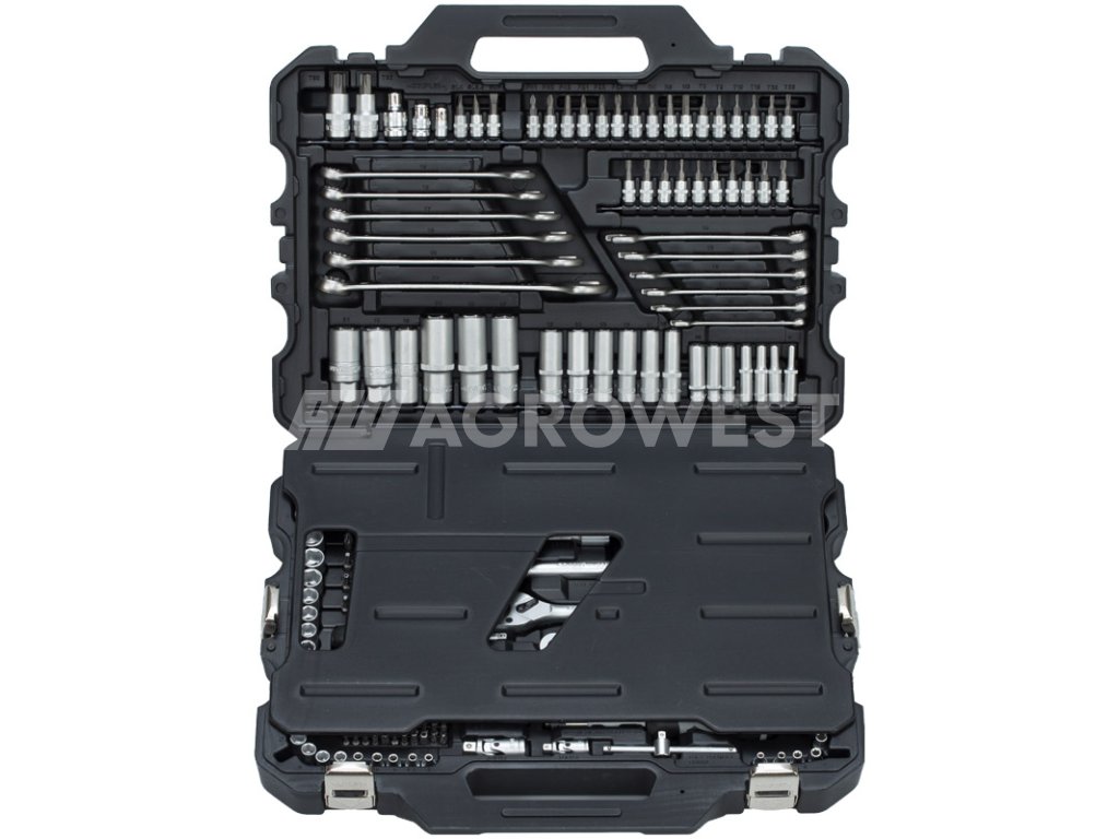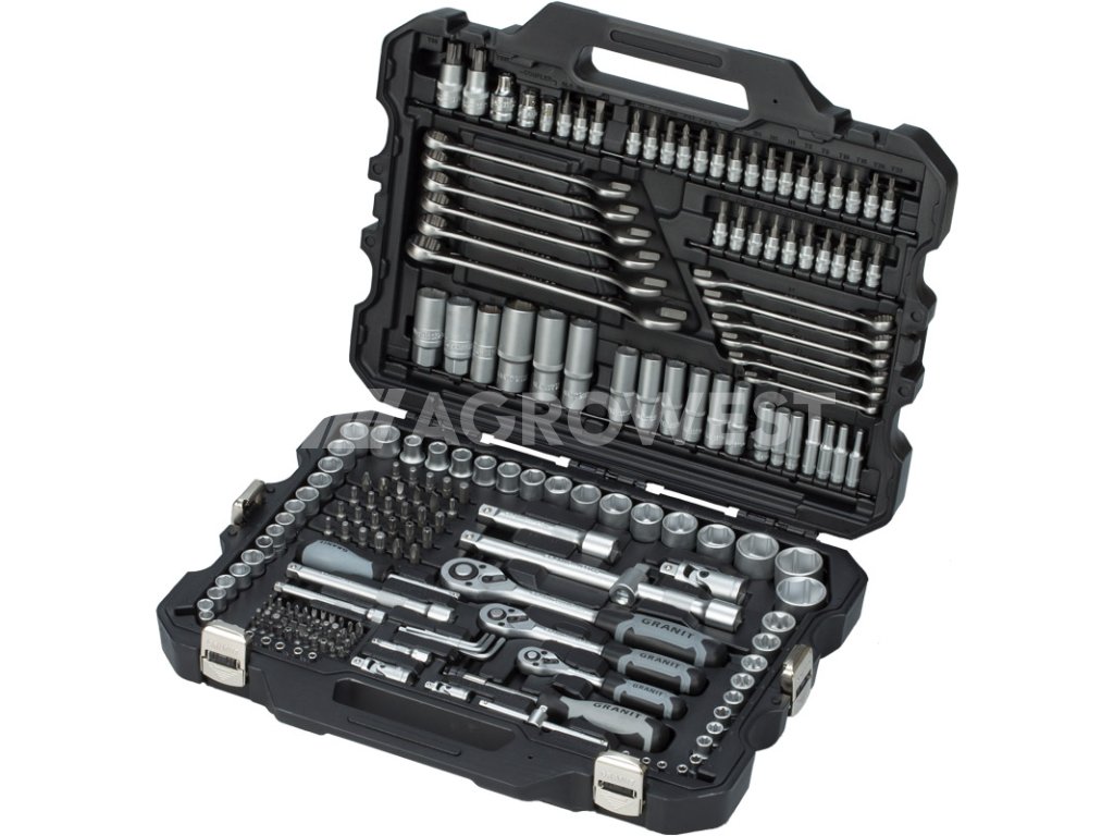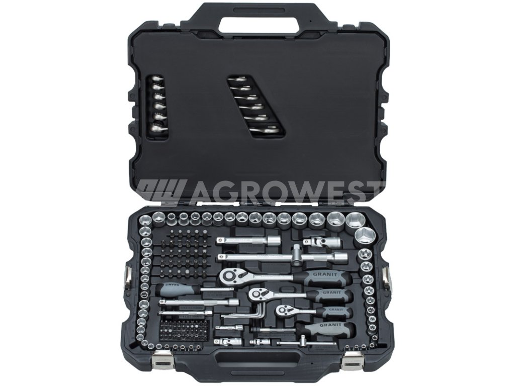 - ve vysoce kvalitním, velmi stabilním kufru na nářadí GRANIT BLACK EDITION s kovovými sponami, organizačním systémem a plastovou přepážkou pro optimální uchycení nářadí