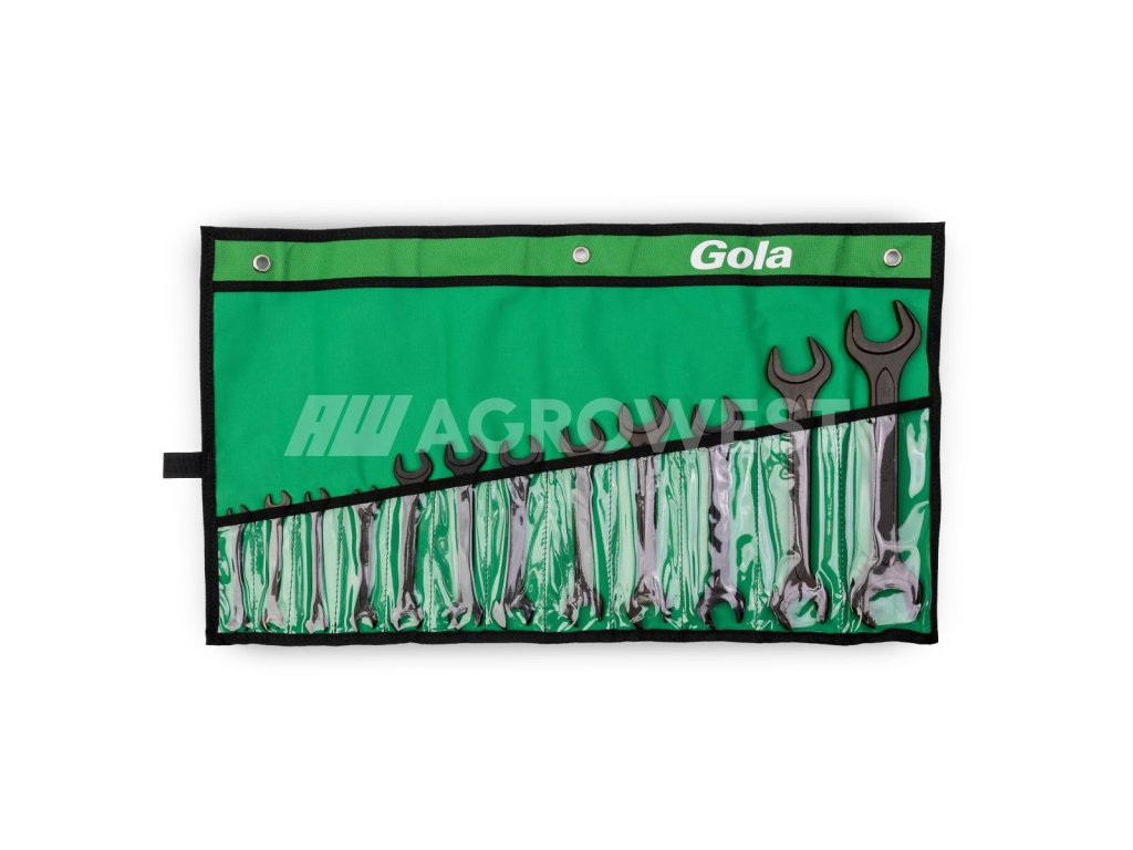 Pečlivě sestavená GOLA sada otevřených oboustranných klíčů, 7x8-30x32, 12 dílů, textilní obal, DIN 895.