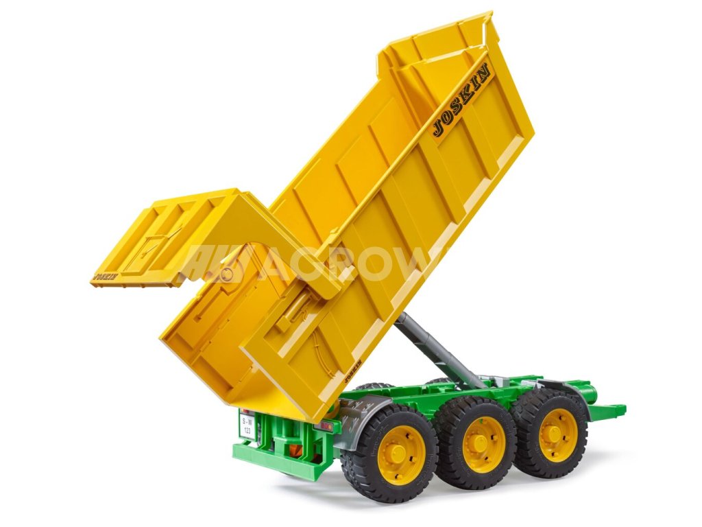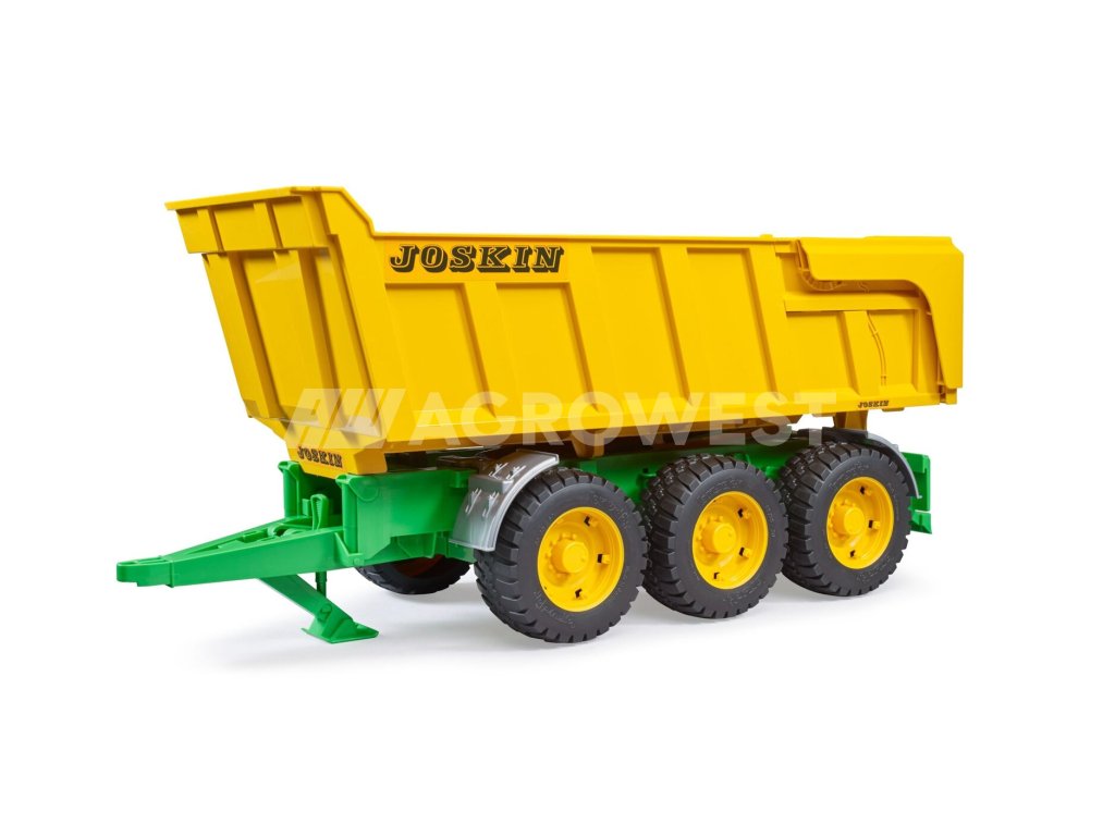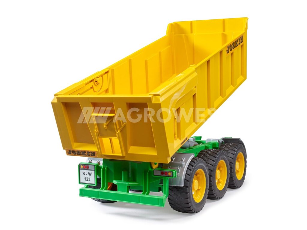 Prostorný sklápěcí vůz Joskin je báječným doplňkem k modelům značky Bruder. Kompatibilní je se všemi traktory z Profi série, disponuje sklápěcí opěrnou nohou a polohovatelnou korbou s otevíracím zadním čelem a vikýřem na obilí. Komfortní jízdu v jakémkoli terénu zaručují tři nápravy a odolné pneumatiky.