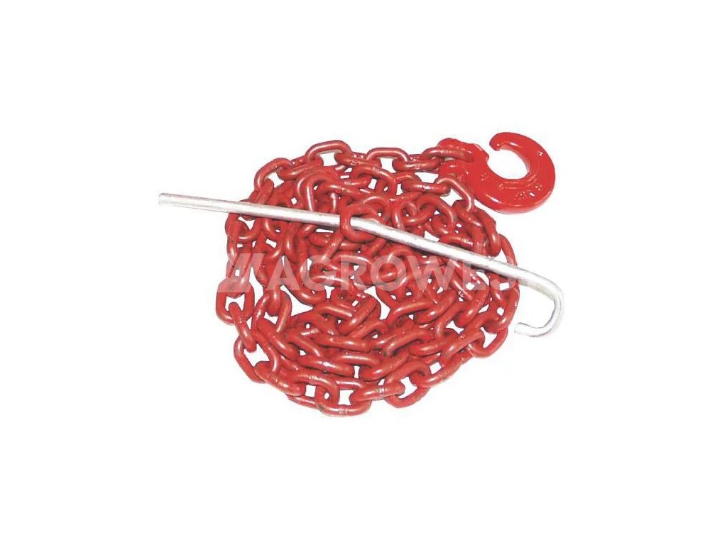 Lesnický řetěz kulatý G8 síla 8 mm délka 2 m s hákem a průvlečnou jehlou - řetězový úvazek, robustní řetěz s průvlečnou jehlou na straně jedné a kluzným hákem (rozříznutý kroužek) na straně druhé pro zavěšení do prokluzných lanových ok.